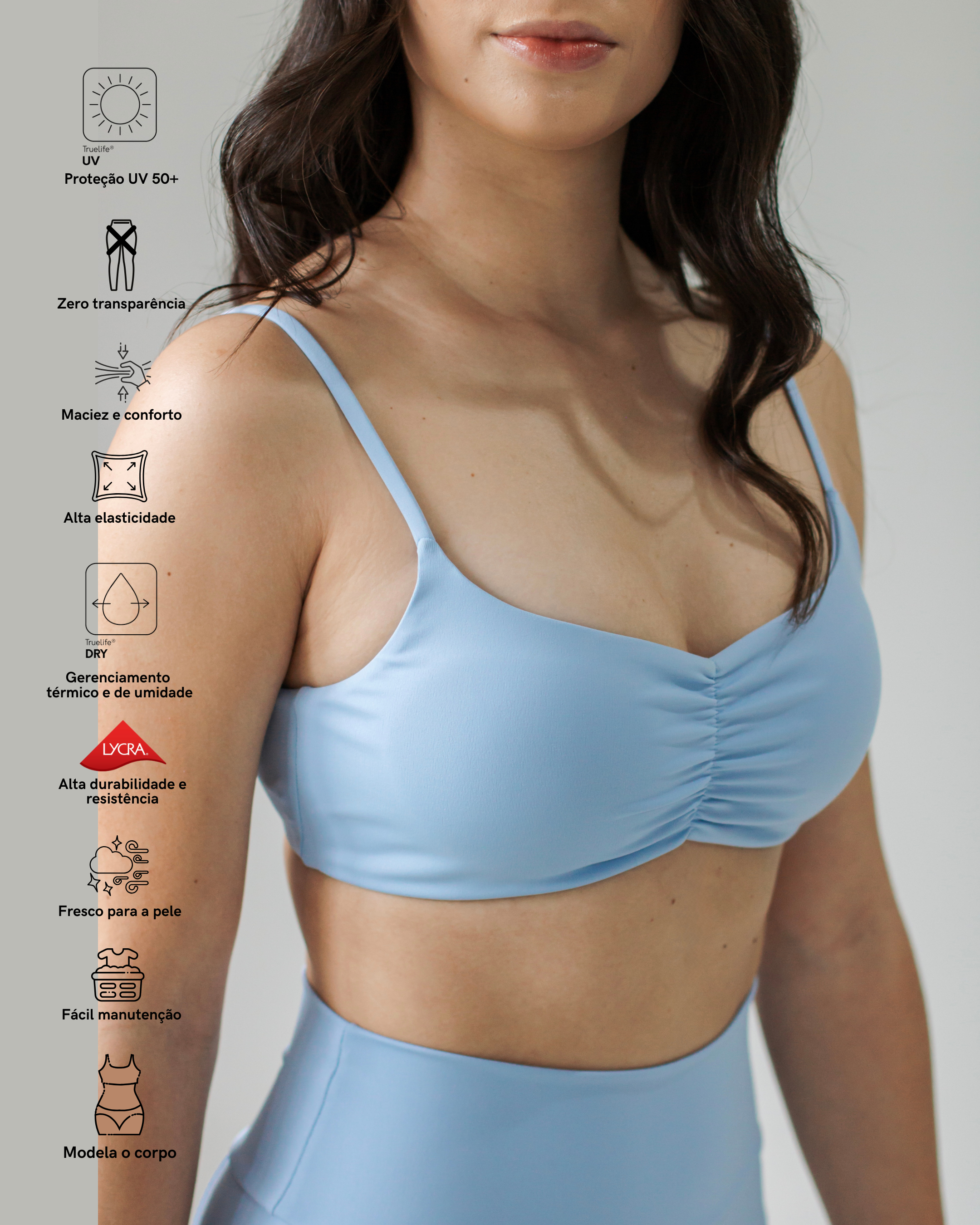 | Tecido | Proteção UV 50+, Lycra, Truelife UV, Truelife Dry, Zero Transparência, Disfarça imperfeições, Modela o corpo, Gerenciamento térmico e de umidade, Respirabilidade, Toque fresco e macio, Alta elasticidade e conforto, Easy Care |
